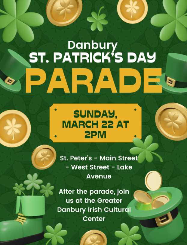 Mar 22 – St. Patrick’s Day Parade – starts at 2 pm. Step off at St. Peter Catholic Church (104 Main St.) and ends at the Greater Danbury Irish Cultural Center (6 Lake Ave.). Shuttle buses to St. Peter begin at 12:30 pm.