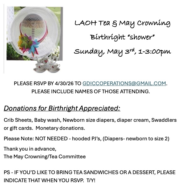 LAOH Tea & May Crowning Birthright “shower” – Sunday, May 3rd from 1 – 3 pm